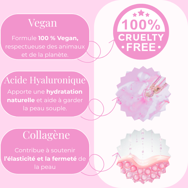 Une formule vegan et clean, testée en laboratoire, enrichie en acide hyaluronique et collagène pour des résultats visibles.